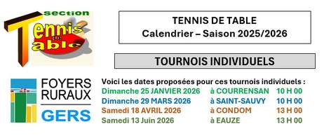 La saison Tennis de Table se poursuit avec le 2ème Tournoi Individuel le :
